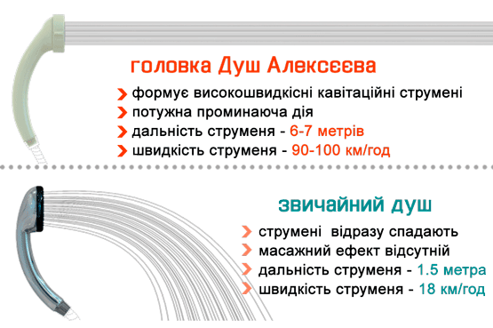 3. Завдяки кавітаційному ефекту надшвидкісних струменів Душа Алексєєва на поверхні шкіри утворюється киплячий шар води, за рахунок якого здійснюють повноцінний пілінг, який не травмує шкіру, при цьому попутно забезпечує її вапоризацію водяним пилом. Відбувається очищення шкіри тіла і голови без застосування будь-яких миючих засобів (мило, гелі, шампунь).